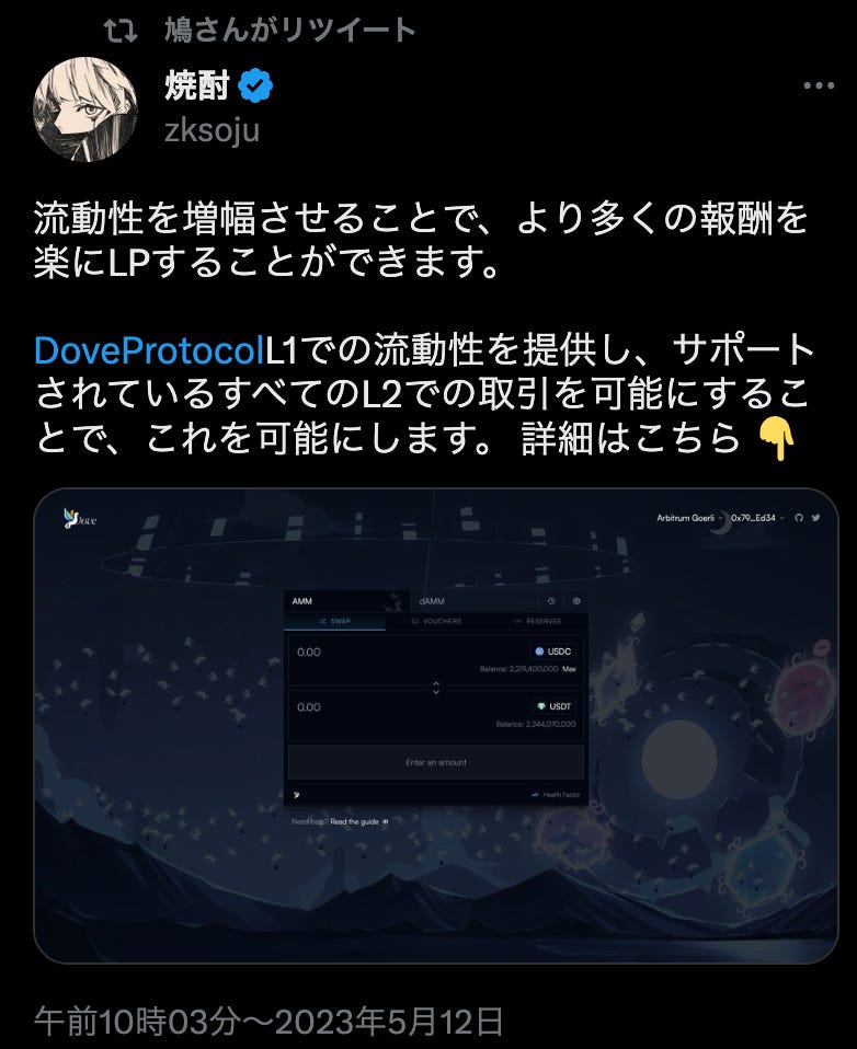 LayerZeroの技術をベースに開発されているクロスチェーンDEX. L1のLPをL2で取引できるらしい。今後深掘りしたいものプロジェクト.
