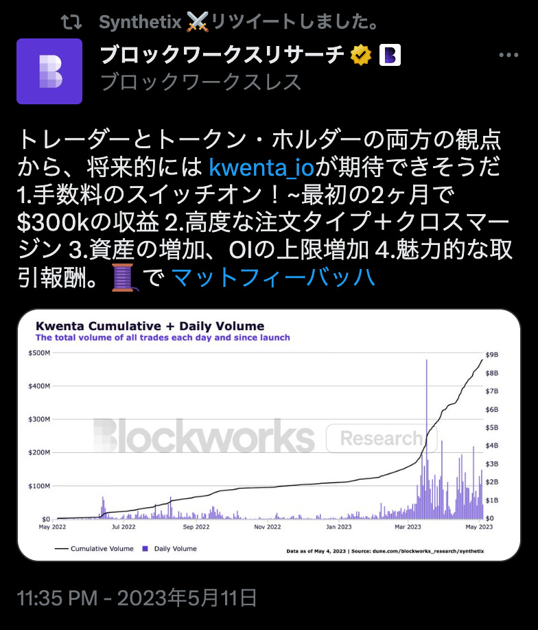 Synthetix上で展開されているPerp DEXのKwentaの現状についてのスレッドです。SynthetixがSIP 2002でPerp DEXに手数料を分配するようになったこと受けて、Kwentaのバリエーションを評価しています。