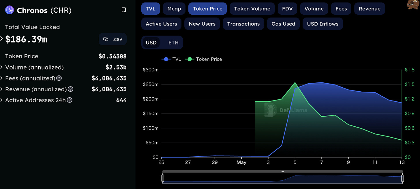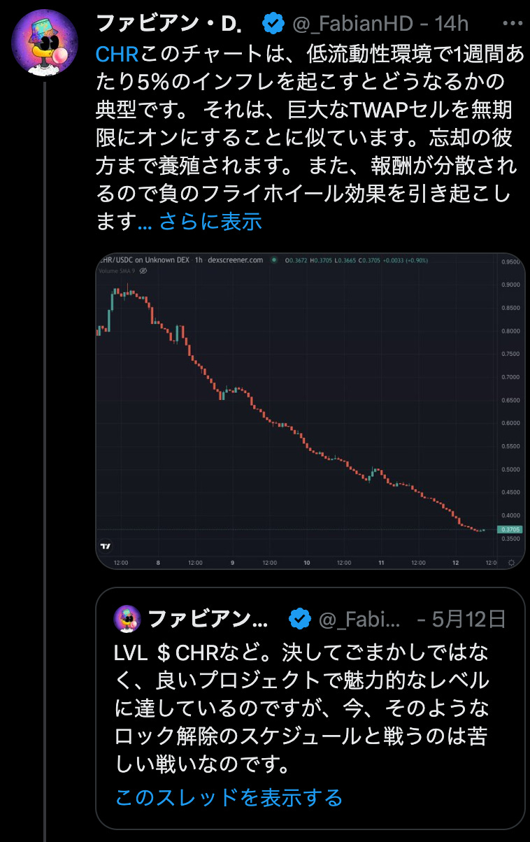 ArbitrumでNo.1のve(3:3) DEXであるChronosのトークン価格が下がり続けています。ネイティブトークンを報酬として配っているところは、ひとたびトークン価格が崩壊すると、LPに提示される利回りも低下するため流動性を維持することができなくなり、トレーダーも去ってしまうという負のフライホイールが回ってしまいます。