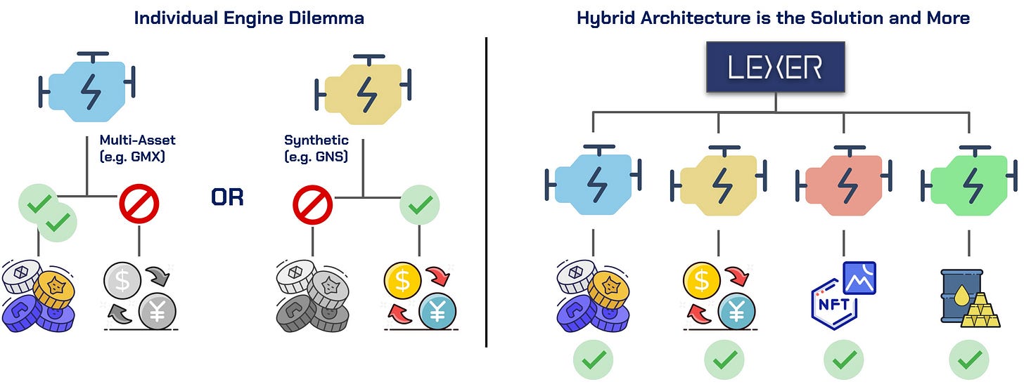 メリットはオラクル(リアルタイムの価格提供システム)があれば、何でも取引可能である点です。LEXERはChainLinkのオラクルを使用するため、ChainLinkが情報を提供しているものなら何でも取引可能です。これにより、NFTやコモディティ、S&P500といった指数なども扱うことが可能です。